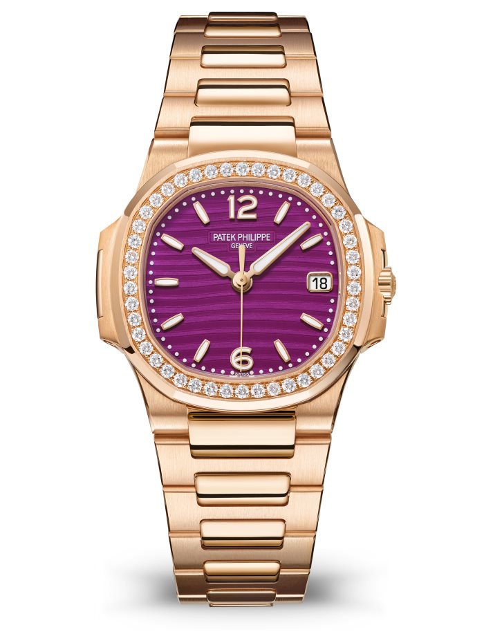 Lacquered purple, “wave” motif, rose gold applied ogival-shaped hour markers and numerals with white luminescent coating.
