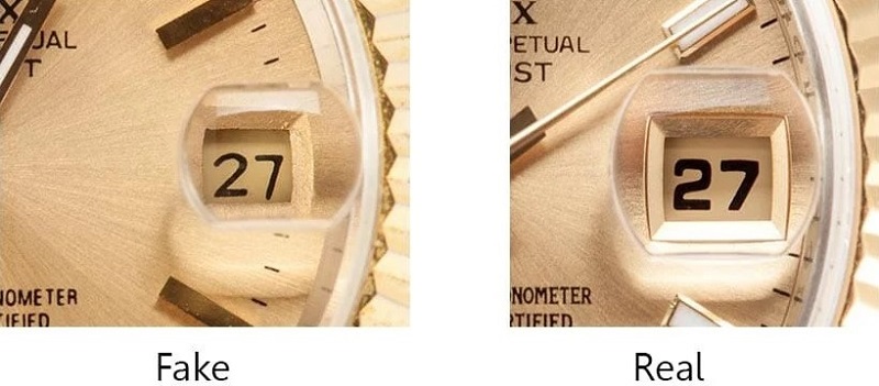 Cyclops lens trên đồng hồ Rolex giả mạo thường có độ phóng đại không đồng đều hoặc không đạt được mức độ phóng đại như mong đợi. Đôi khi, cyclops lens giả mạo có thể không phóng đại hoặc phóng đại không đúng cách, tạo ra sự không bình thường và khó đọc khi nhìn vào ngày tháng.