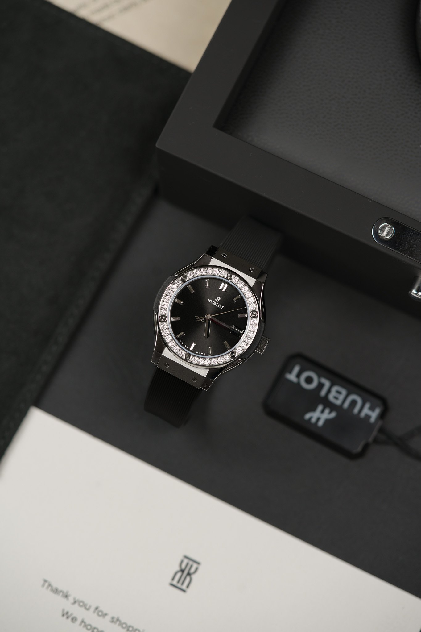 Hublot Classic Fusion Titanium Diamonds 33mm là một chiếc đồng hồ dành cho nữ giới, mang vẻ đẹp sang trọng, tinh tế và đầy cá tính. Dưới đây là mô tả chi tiết về chiếc đồng hồ này: